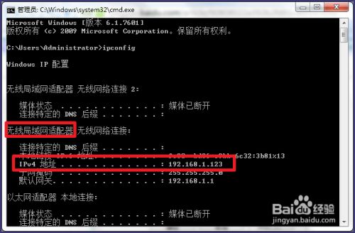 2、然后在打开的窗口种输入「ipconfig」,然后回车